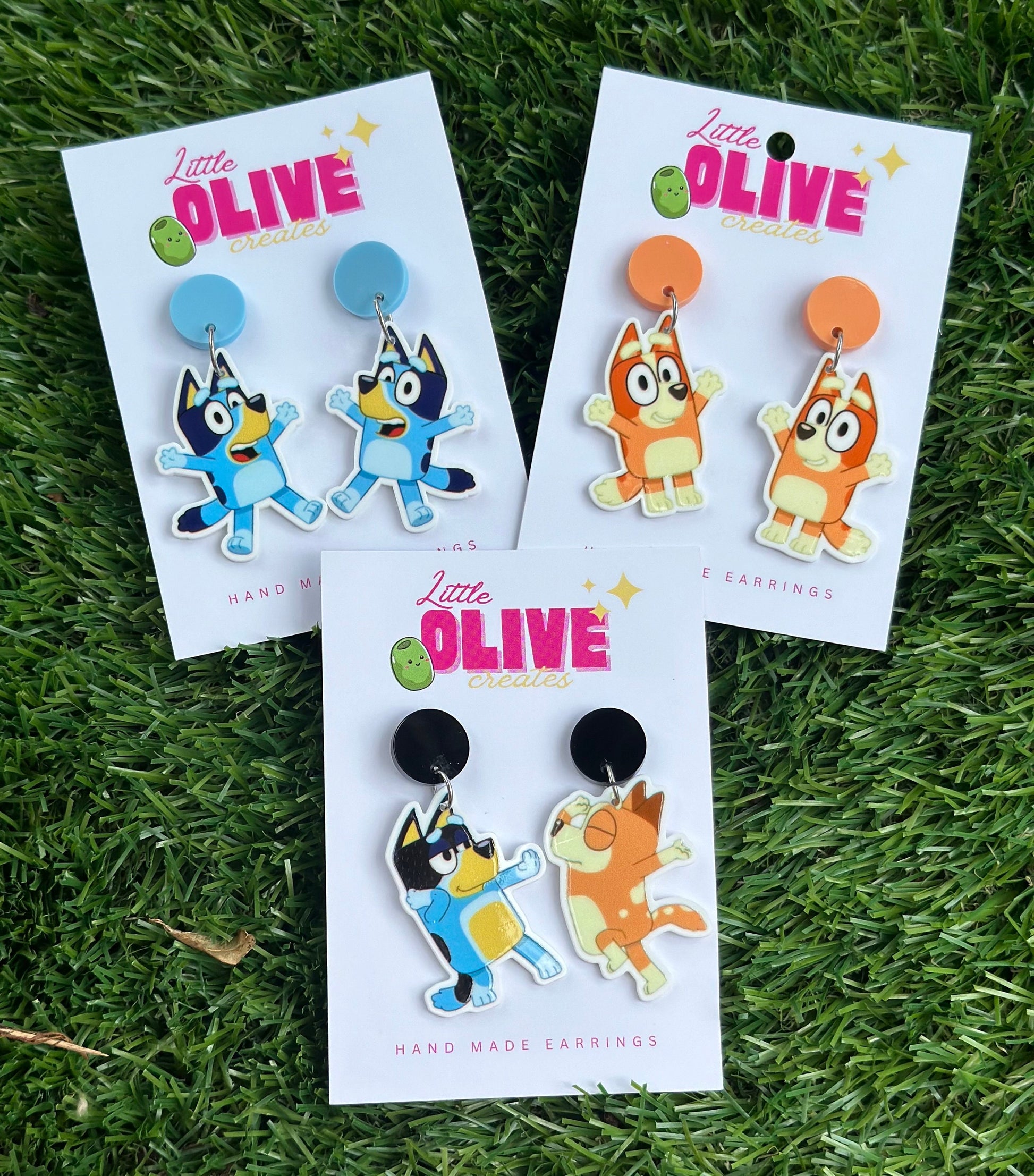 "Adorable Bluey Dangle Earrings - Choose from 4 Variations (15mm Stud Top, Total Drop 55-60mm)"