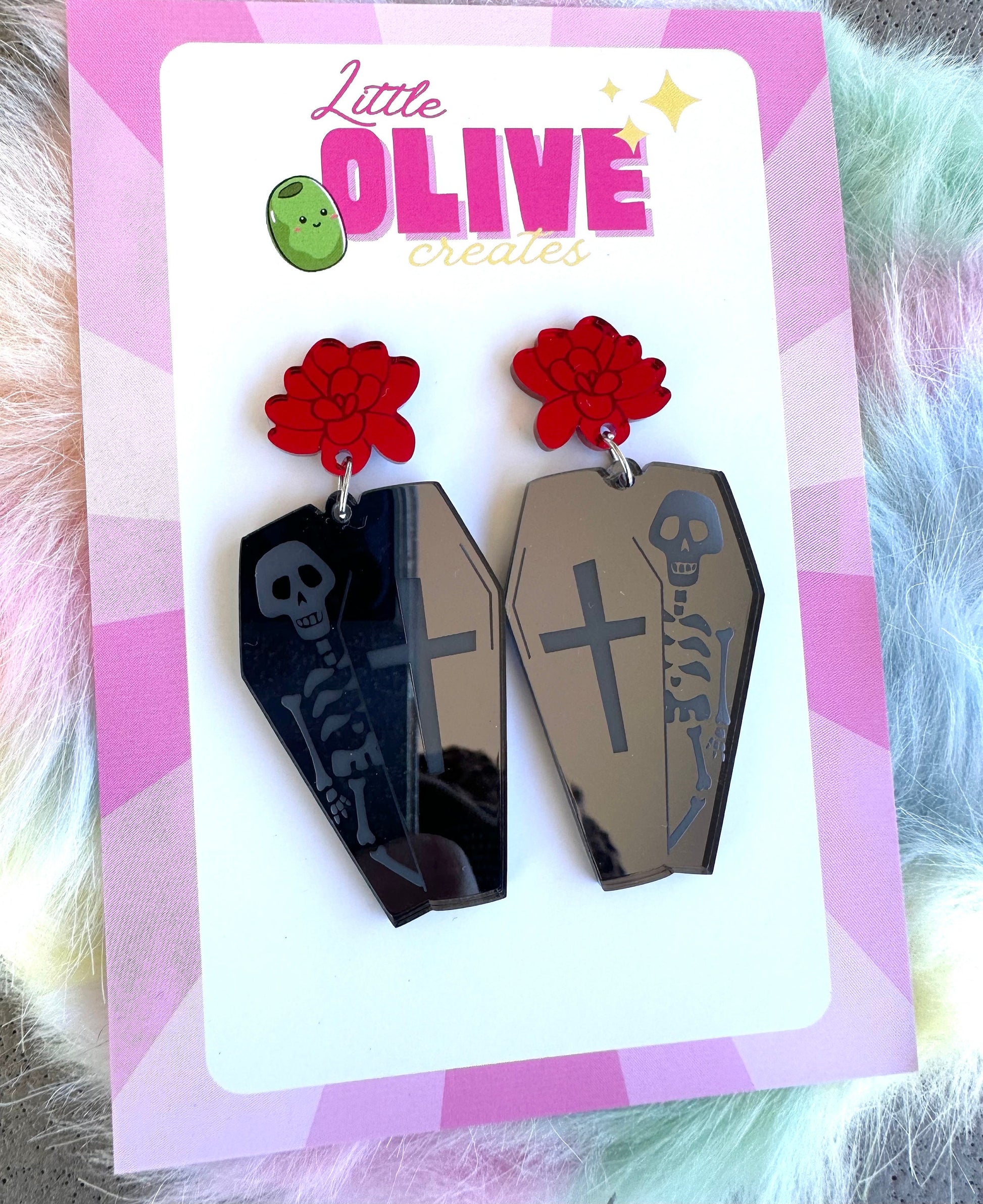 Our coffin dangle earrings are designed to capture the spirit of Halloween with a touch of sophistication. The combination of vibrant red mirror acrylic and smoky mirror acrylic creates a mesmerizing contrast that's perfect for the spooky season.