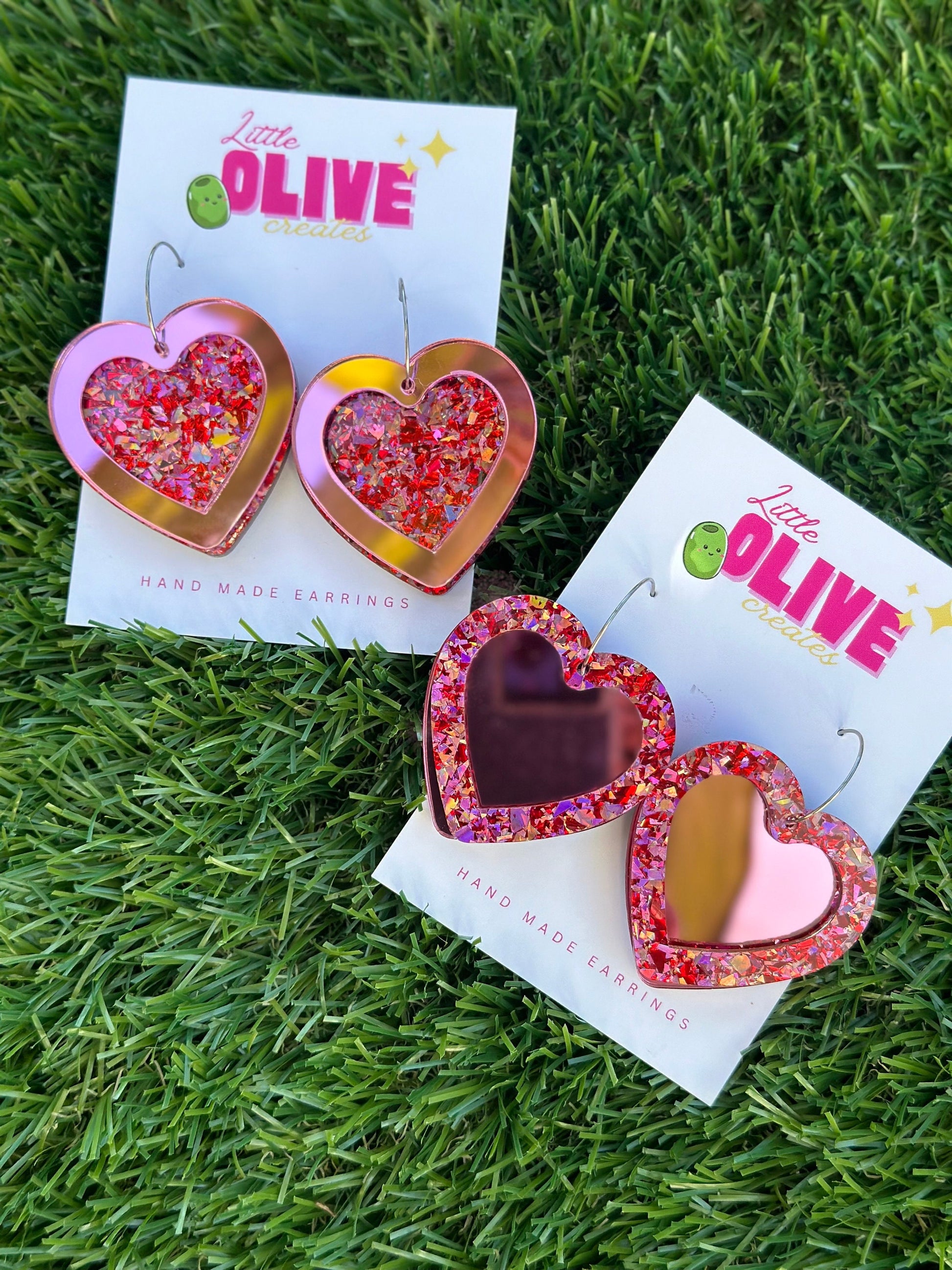 Elevate your Valentine's Day style with these stunning double-layered heart earrings. Crafted from mesmerizing pink mirror and sparkling chunky glitter acrylic, these earrings are a celebration of love and glamour. The hearts gracefully dangle from silver stainless steel hoops, creating a charming and romantic accessory.