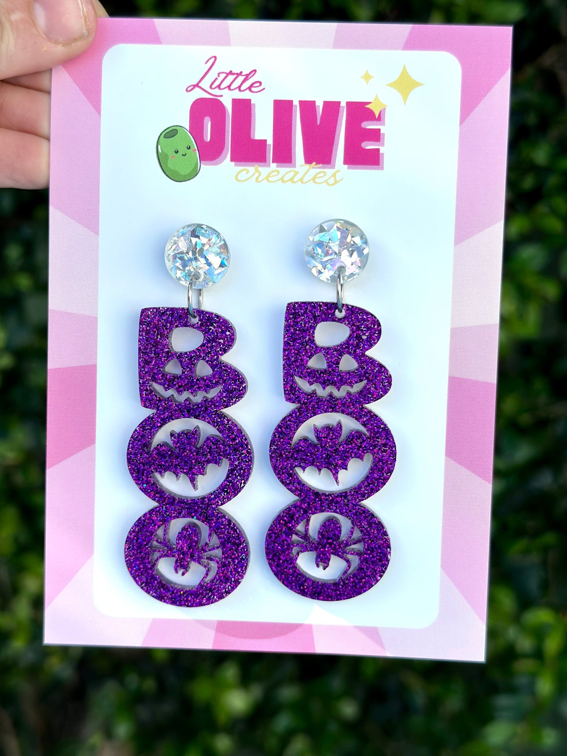 Purple Glitter 'BOO' Halloween Dangle Earrings - Spooky Glamour in Purple
