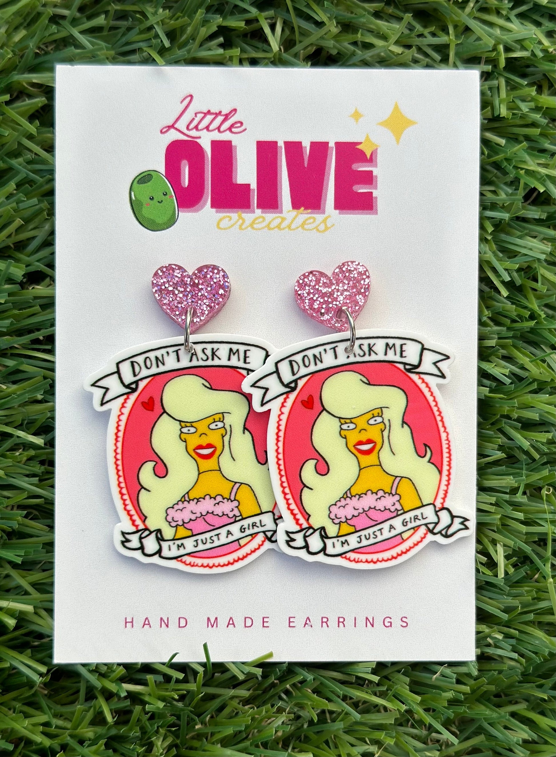 Embrace your inner sass with these playful earrings inspired by the iconic Malibu Stacey doll from The Simpsons. Featuring the bold quote "Don’t ask me, I’m just a girl," these earrings are sure to make a statement wherever you go.