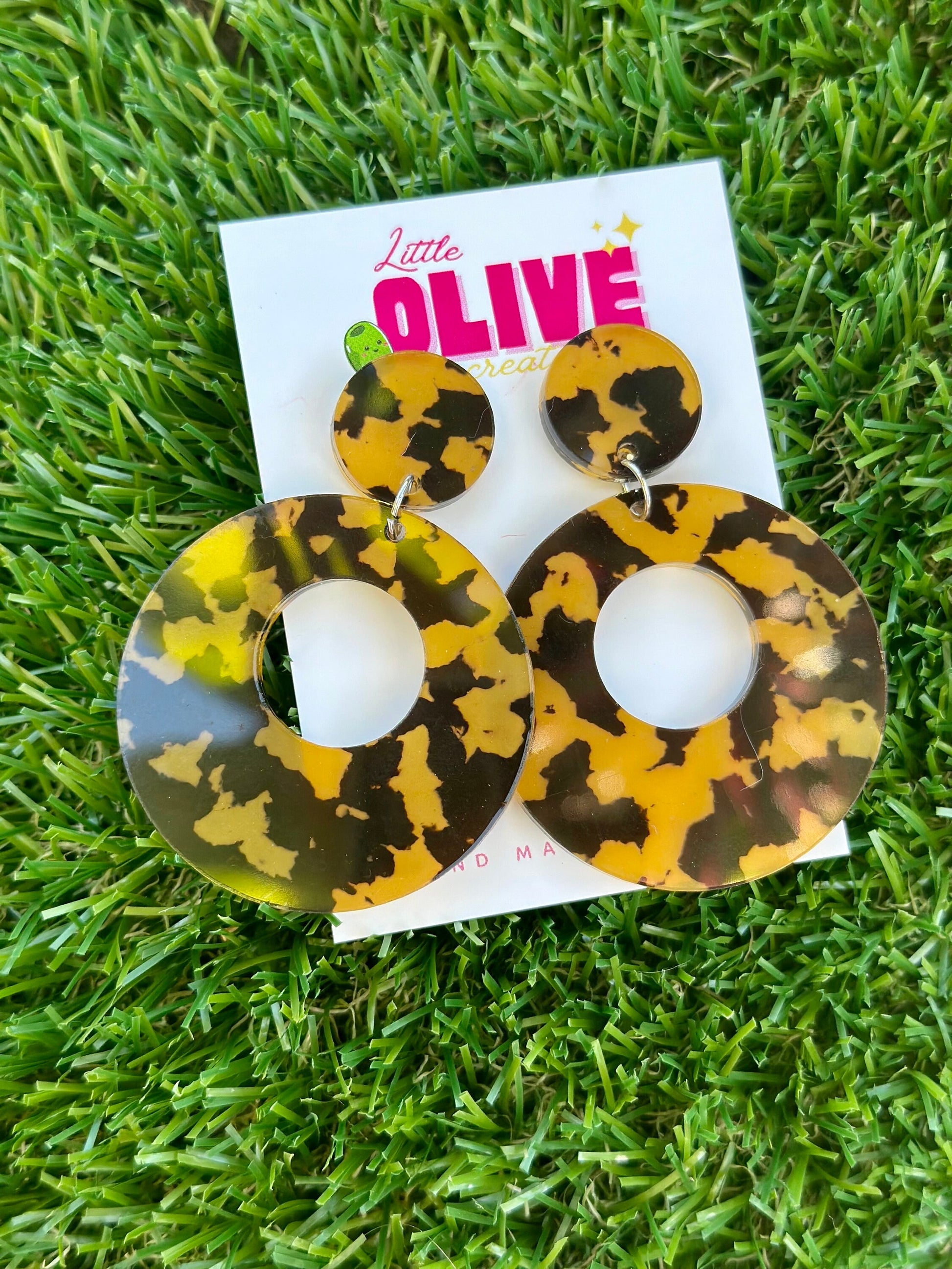 Get ready to turn heads with these vibrant and stylish retro-inspired dangle hoops. The playful tortoise shell print adds a touch of whimsy to your ensemble. Here's why you'll love them:
