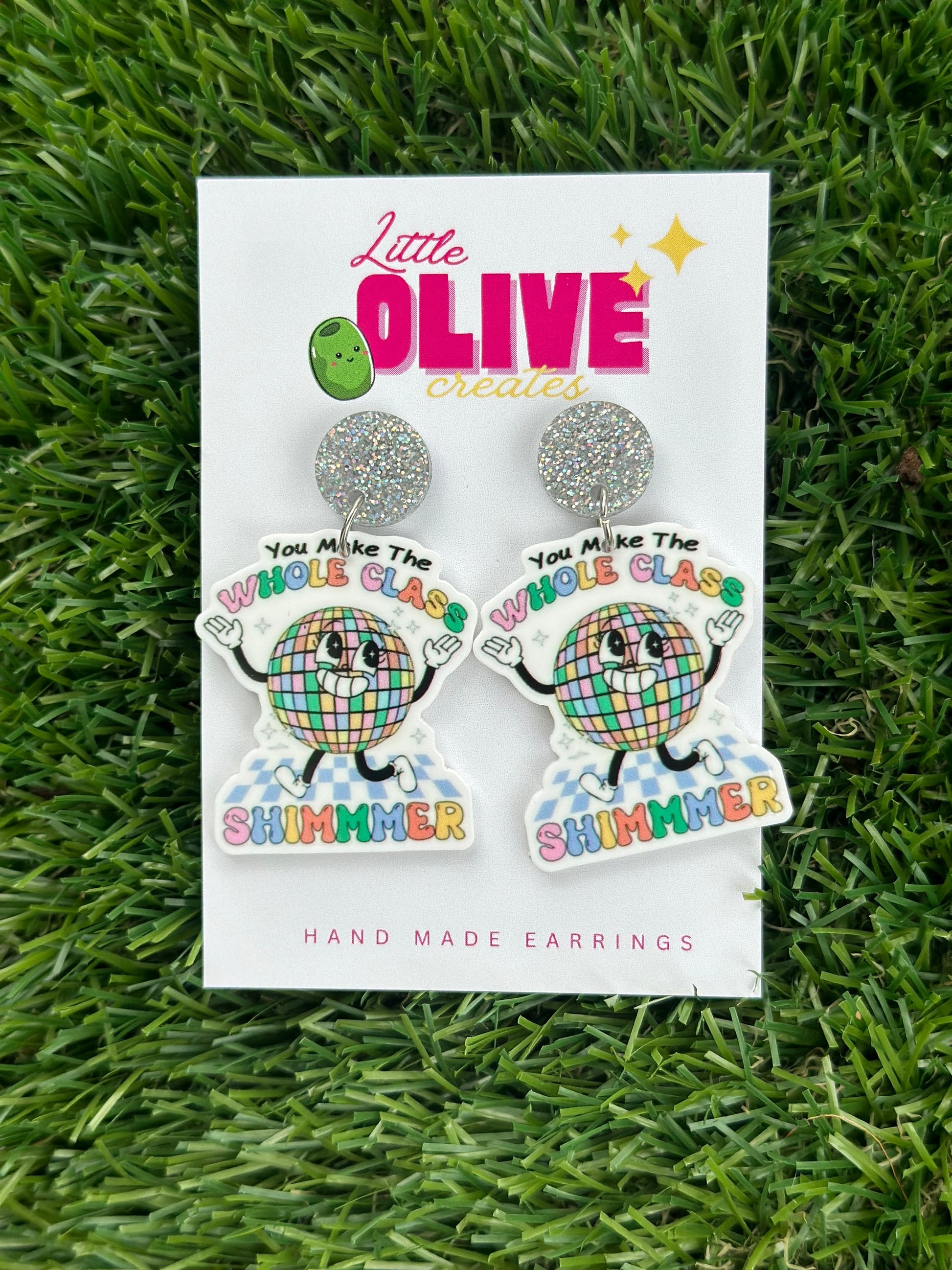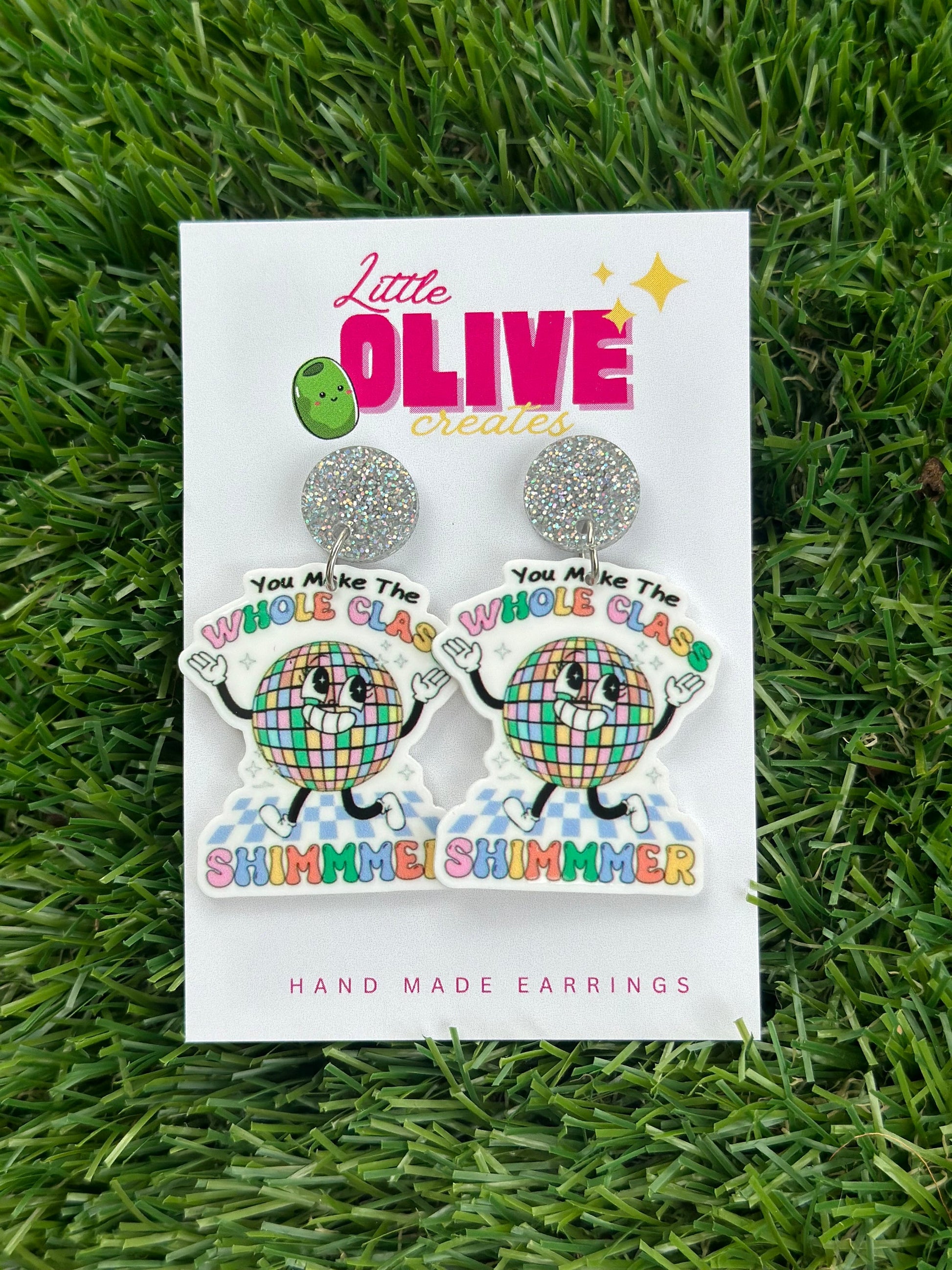 Celebrate your teaching journey with these enchanting earrings inspired by Taylor Swift's empowering lyrics. Featuring the heartfelt message "You make the whole class shimmer," these earrings add a touch of sparkle to your everyday look. Perfect for teachers who love a bit of pop culture flair!