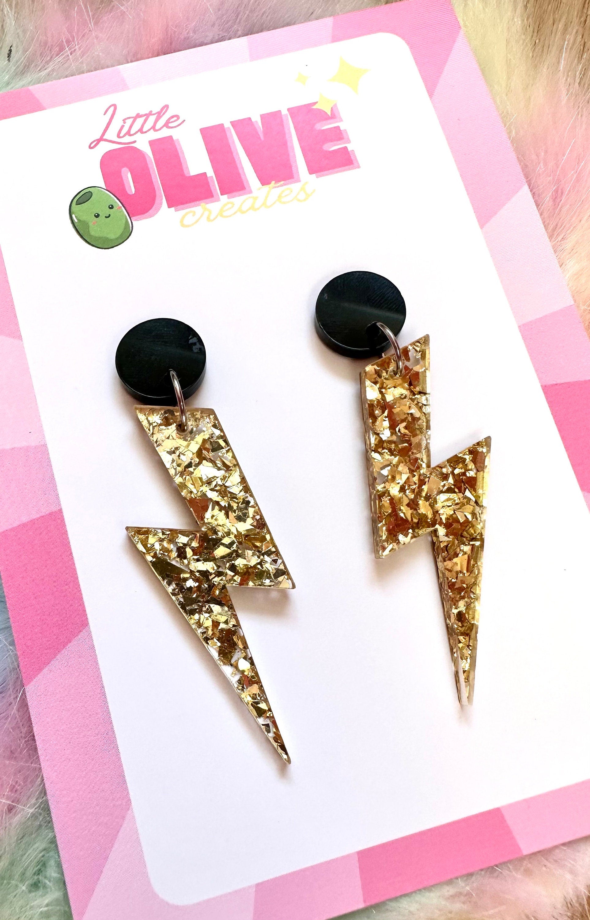 Sparkling Gold Glitter Lightning Bolt Statement Earrings
