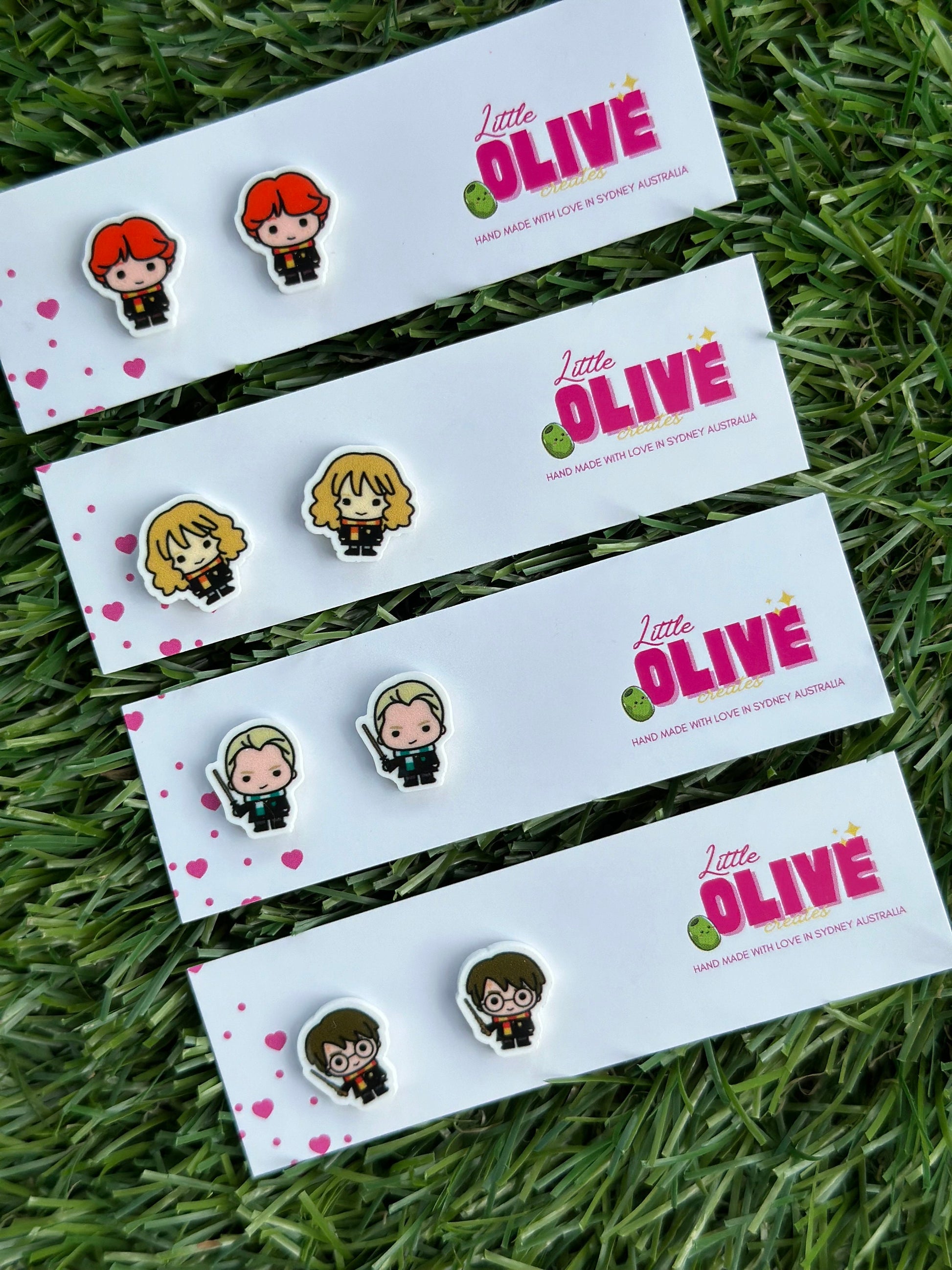 Choose from your favorite characters: Harry, Ron, Hermione, or Draco Malfoy. Each pair features stainless steel hypoallergenic posts for comfortable wear and detailed designs measuring approximately 13-15mm.